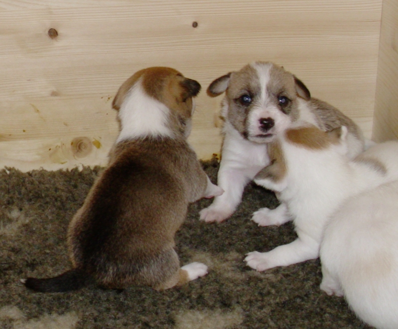 Unsere Welpen erkunden die Umwelt und auch das Gegenüber. Podengo Portugues Pequeno im Alter von 3 einhalb Wochen fangen an zu Pföteln und zeigen erstes Spielverhalten.