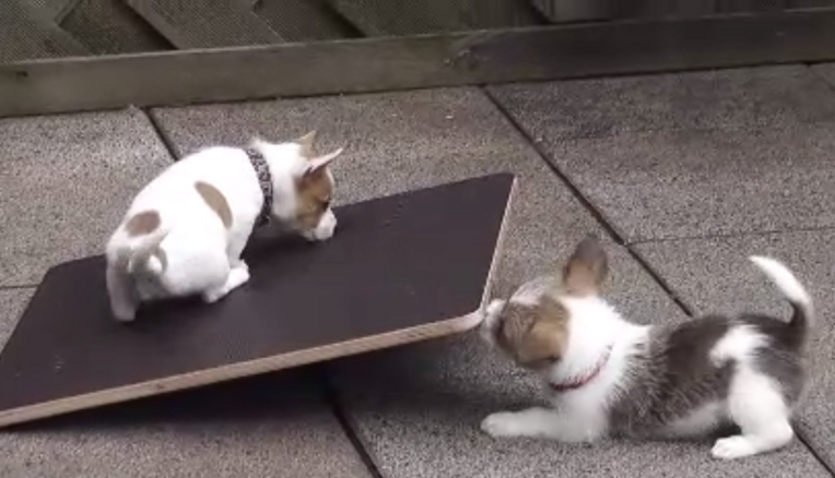 Ein Wackelbrett für die Welpen zum Trainieren der motorischen Fähigkeiten. Kein Akt für die kleinen Podengos….das Ding wird nicht nur erklettert, sondern attackiert, weil es die Schwester in Schräglage nicht her gibt.