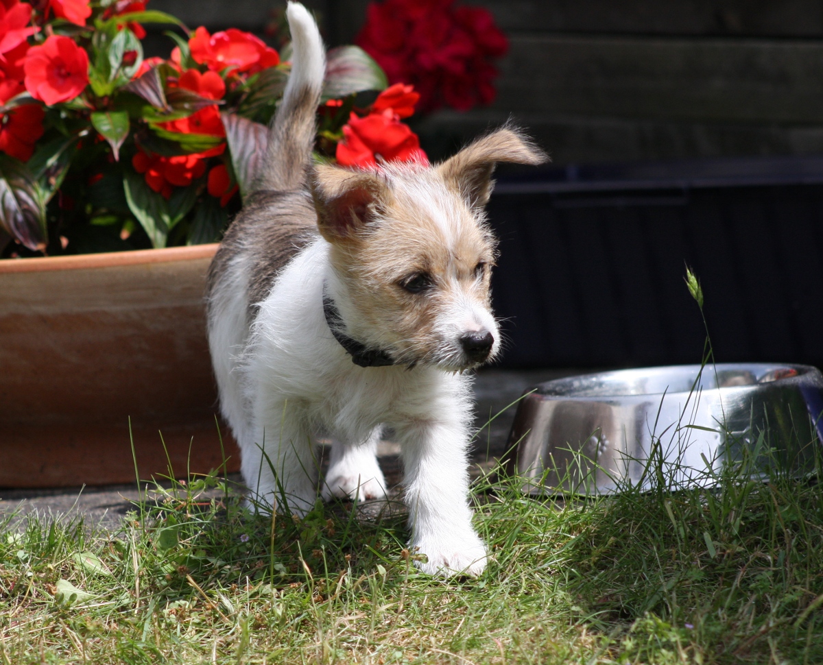 Viel Geduld und Zeit braucht es und ein gutes Auge für die Dinge, die den Welpen interessant erscheinen. Auch Florentina hat hier einen vorwitzigen und nicht abgemähten langen Halm entdeckt und will ihn sich schnappen.