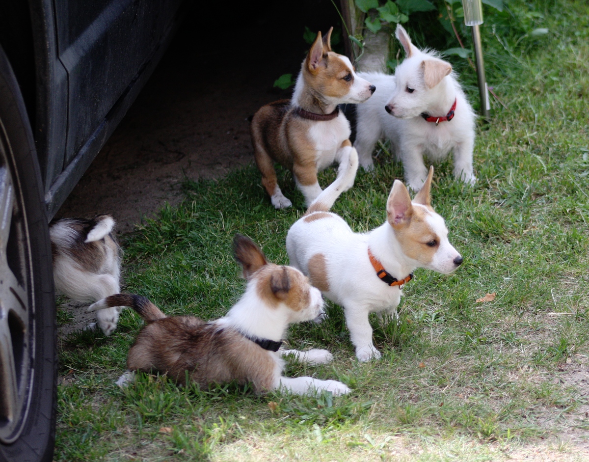 Alles gemeinsam machen im Welpenalter: Sicherheit im Kollektiv. Fremde Umgebung? Da bleiben sie lieber in der Nähe des bekannten Autos.