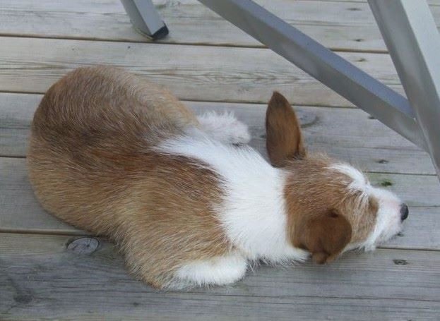 Hunde in der Größe bzw. Kleinheit eines Pequeno werden in der Regel verzärtelt mit Kissen und Körbchen, Tragetäschchen und Mäntelchen und all dem unnötigen Kram. Ein kleiner portugiesischer Podengo ist noch ein richtiger Hund und kann es sich ohne Probleme auch auf einem Holzboden gemütlich machen.
