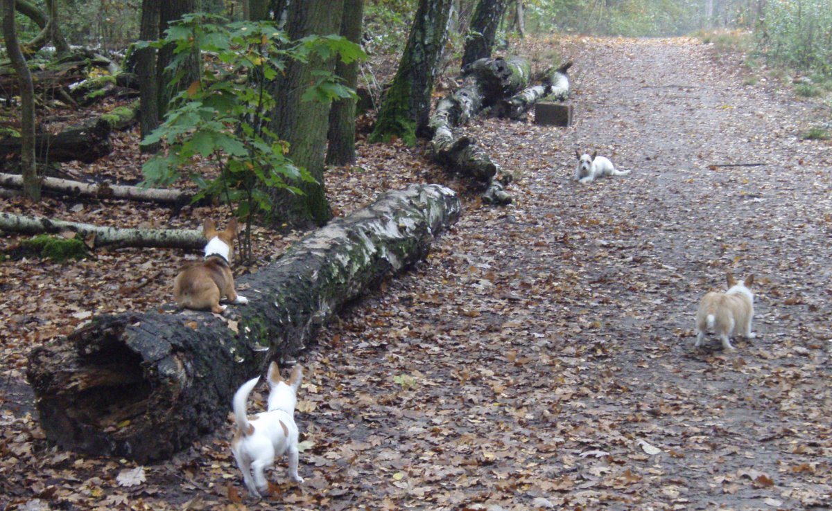 Am Berliner Grunewaldsee amüsieren sich vier kleine Podengo Portugues Pequeno.
