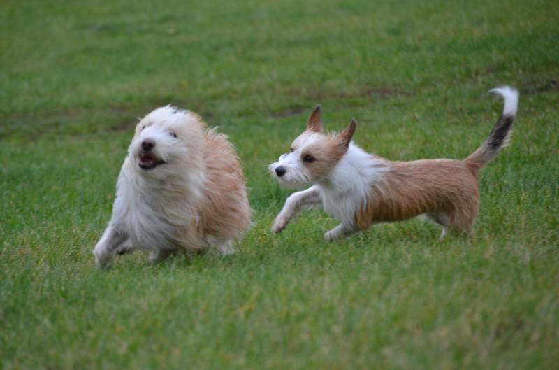 Zwei Podengo Portugues Pequenos spielen und rennen nach Herzenslust.