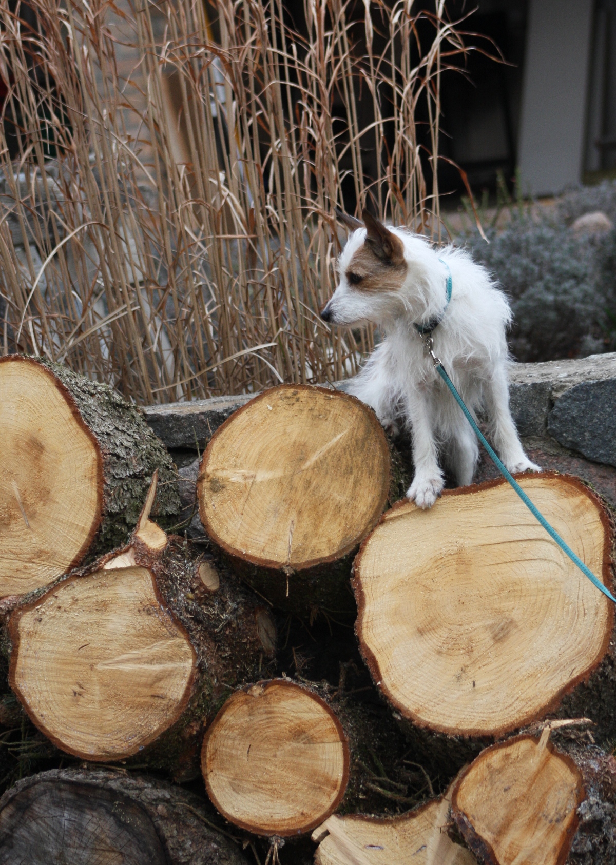 Hiva trohnt auf einem Holzstapel und hält sich überhaupt nicht für einen Zwerg. Klein, aber oho.