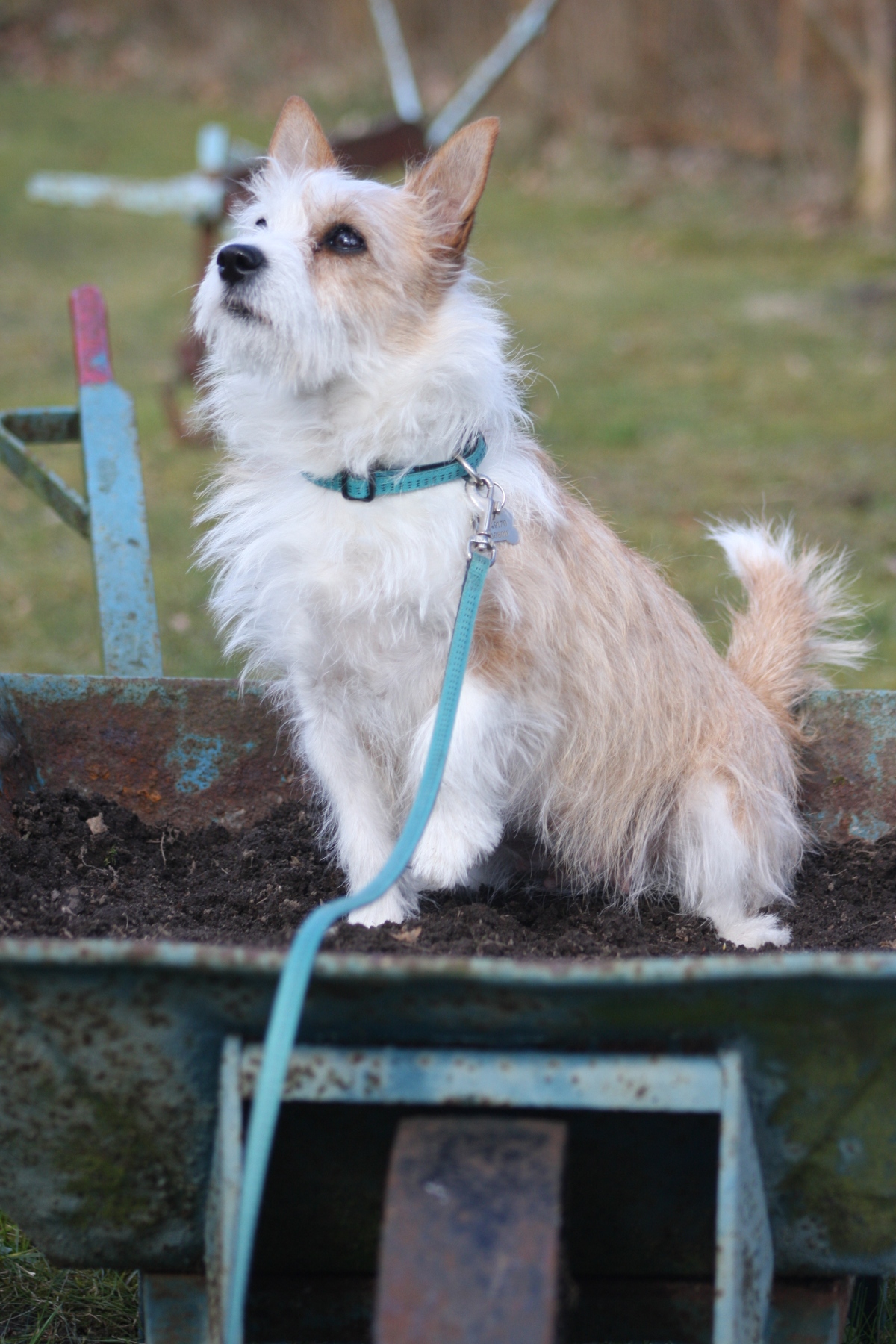 Cachopa in der Schubkarre: Herrchen fahr mich von Napf zu Napf, bitte.