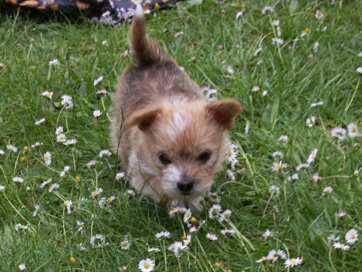 Graciano von den Rottentotten auf einem großen Ausflug. Der Podengo Portugues Pequeno Welpe hat die Blümchen entdeckt.