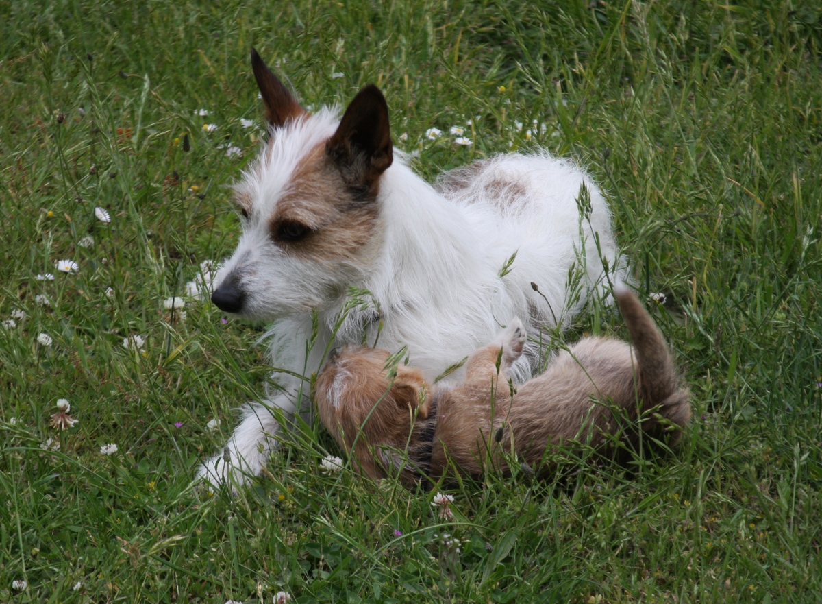 Die Tante der Welpen, Hiva, zeigt sich als eine fürsorgliche Ersatzmutter, Spielgefährtin und Erzieherin.