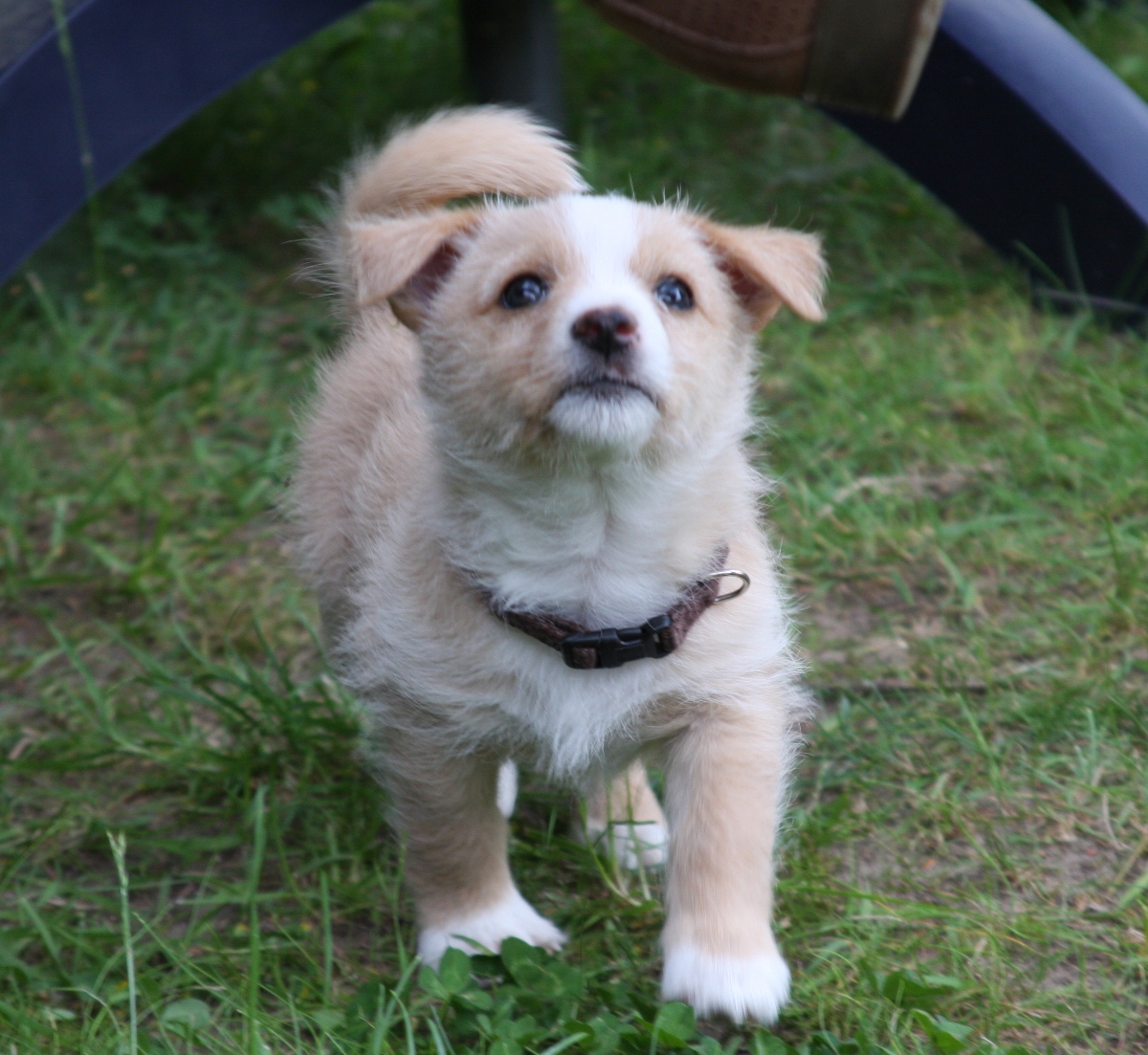 Grandioso schaut nach oben. Das ist gar nicht einfach für einen 7 Wochen alten Welpen, aber seine Aufmerksamkeit ist erstaunlich gut.