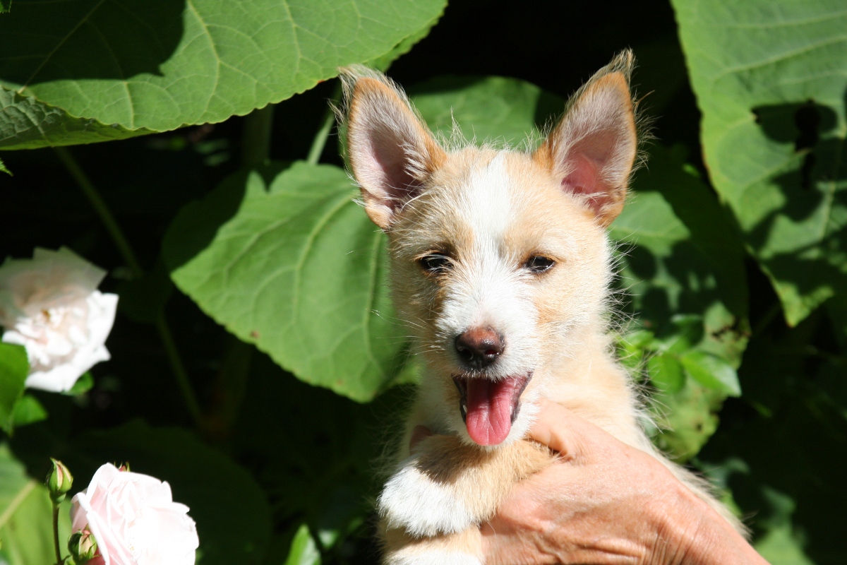 Der kleine Podengo Portugues Pequeno namens Grandioso von den Rottentotten macht sich gut als Rosenkavalier.