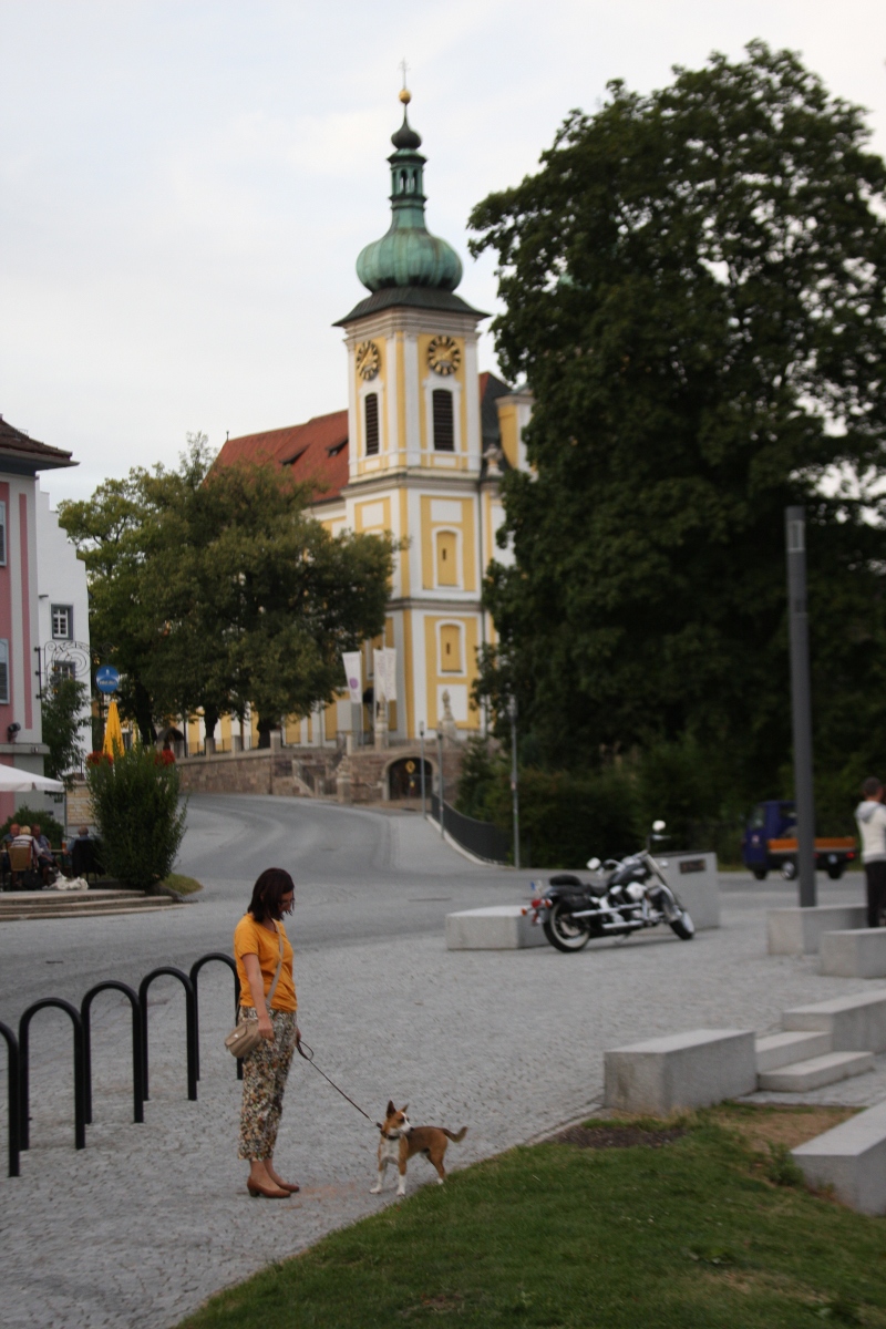 Beinahe zufällig in Donaueschingen, Yvonne mit ihrem Podengo Portugues Pequeno Fernando von den Rottentotten beim Stadtbummel.