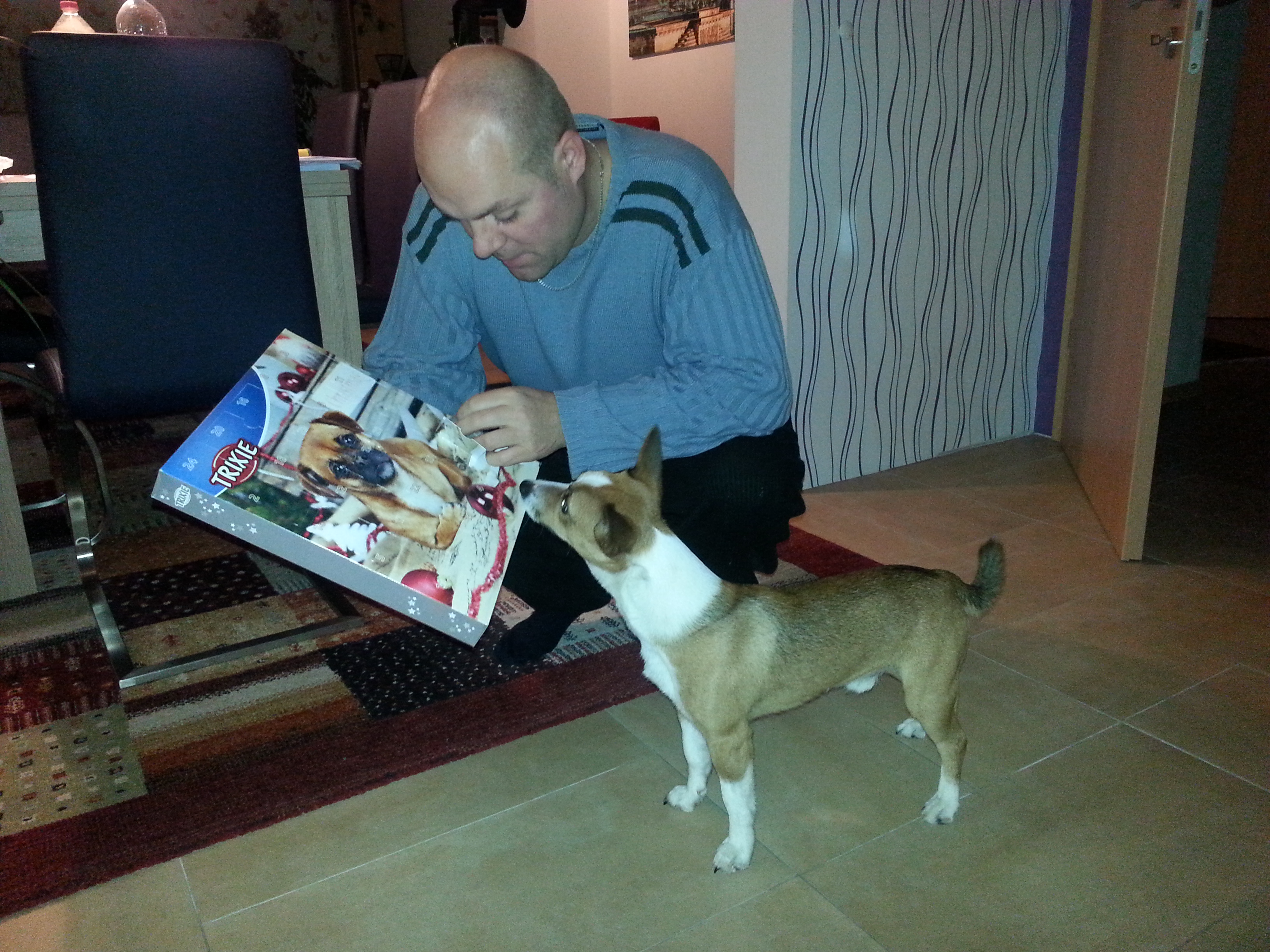 Fernando von den Rottentotten und Herrchen Jörg bestaunen den Adventskalender.