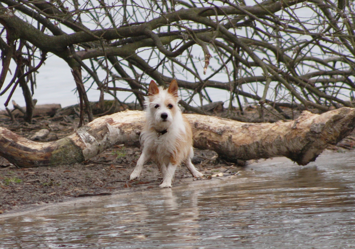 Es war einmal eine Podengo Portugues Peqeuno Hündin, namens Cachopa. Sie hatte sich beim Spurenlesen zu weit entfernt und ihr Herrchen aus den Augen verloren. Plötzlich bemerkt sie es und ihre Sehnsucht wird übermächtig. Sie sucht und horch auf. War da nicht etwas? Ganz weit entfernt entdeckt sie, wo ihr Herz hingehört und sie überlegt, ob sie sich in die Fluten stürzen sollte, um die Abkürzung zu nehmen…Sie ist unentschlossen. Wir haben keine portugiesischen Sommertemparaturen, aber Herrchen ist dadrüben irgendwo. Cachopa denkt und denkt und wenn sie nicht gestorben ist, dann steht sie noch immer da…