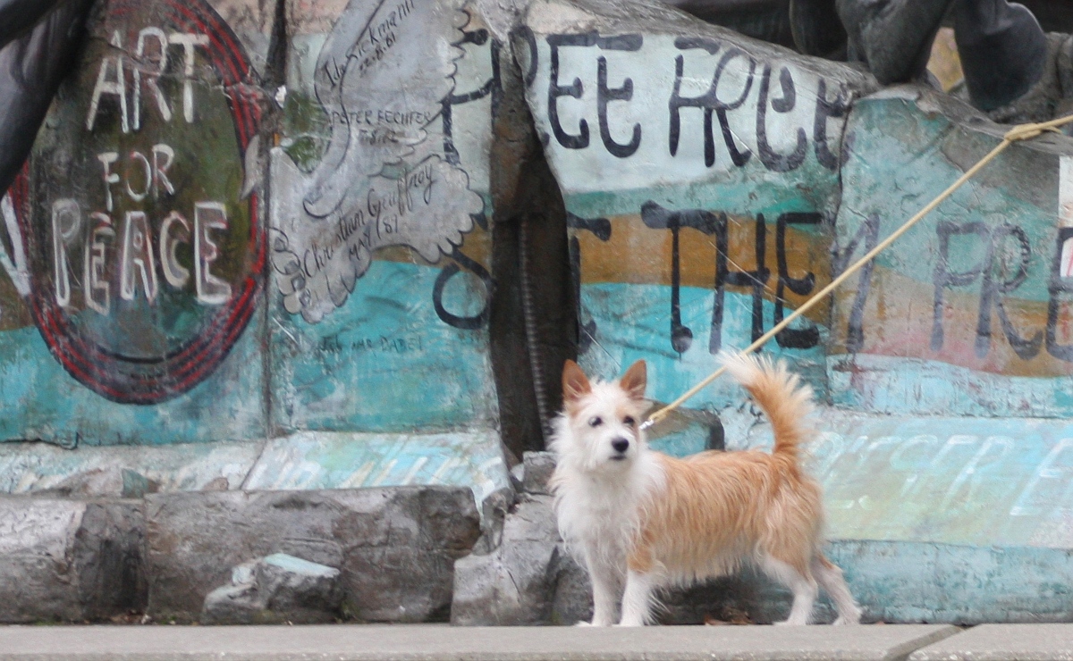 Cachopa posiert vor einem Kunstwerk für den Frieden. Wie schön, Cachopa selbst ist Natur und Frieden.