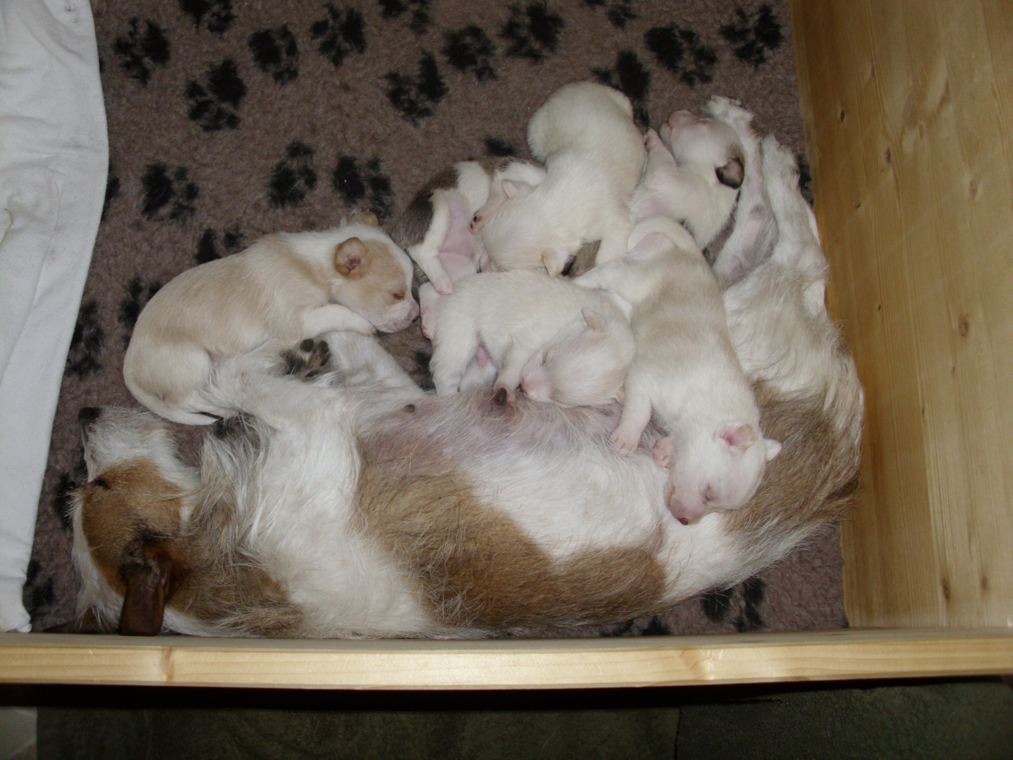 Ein schöner Anblick von einer kleinen Podengo Português Pequeno Familie.