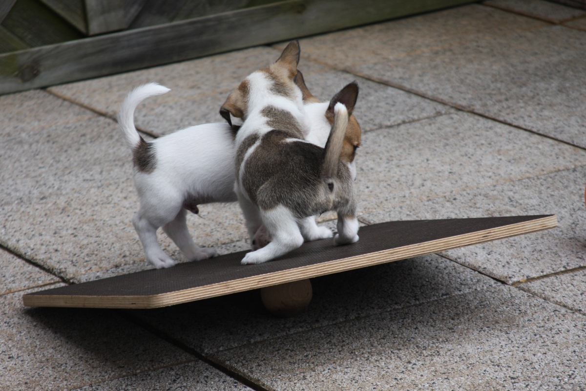 Die Welpen können sogar auf dem Wackelbrett ihre „Kämpfe“ ausführen