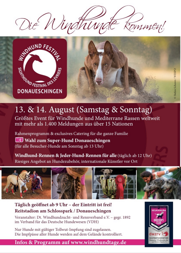 Am 13. und 14.August findet die Jahresausstellung der mediterranen Rassen in Rahmen des Windhundfestivals Donaueschingen statt. Wir werden dabei sein und unsere Podengo Portugues Pequeno vorstellen. Die Vorfreude ist groß.