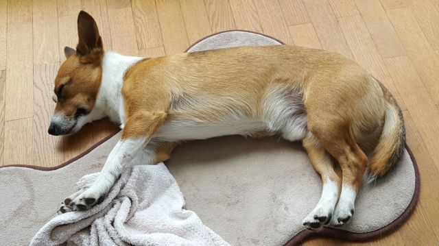 Nach dem Waldspaziergang ist Fernando platt. Immerhin muss ein kleiner Podengo Portugues dreimal so viele Schritte machen, wie ein mittelgroßer Hund mit längeren Beinen. Somit hat er sich den Tiefschlaf verdient.
