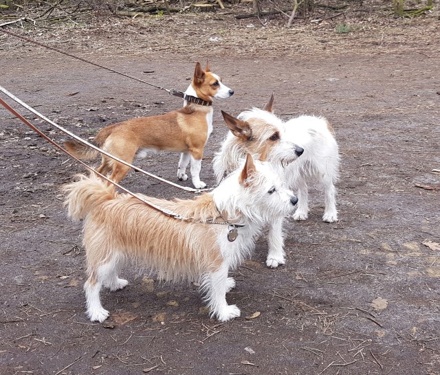 Das sind unsere drei kleinen portugiesischen Podengos, die mit ihrem Herrchen unterwegs sind. Er ist sozusagen der Dog Walker 😉