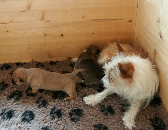 Die Welpenentwicklung geht rasant voran. Augen auf, Ohren auf, Beine vorwärts…und auch schon mit der Schwester „kämpfen“…alles innerhalb weniger Tage.