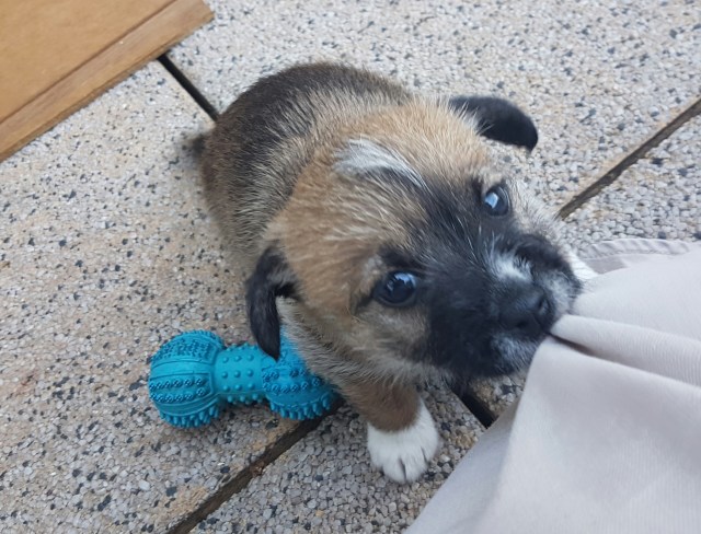 Isadora wird munter. Und im Alter von knapp 5 Wochen ist auch der angestrengte Gesichtsausdruck der Welpen verschwunden. Isadora setzt ihre Mimik ein….und ihre Zähnchen.