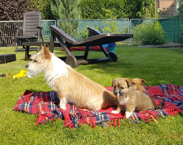 Eine kleine Hundefamilie: Kleine portugiesische Podengo Mutter mit ihren Welpen halten Siesta.