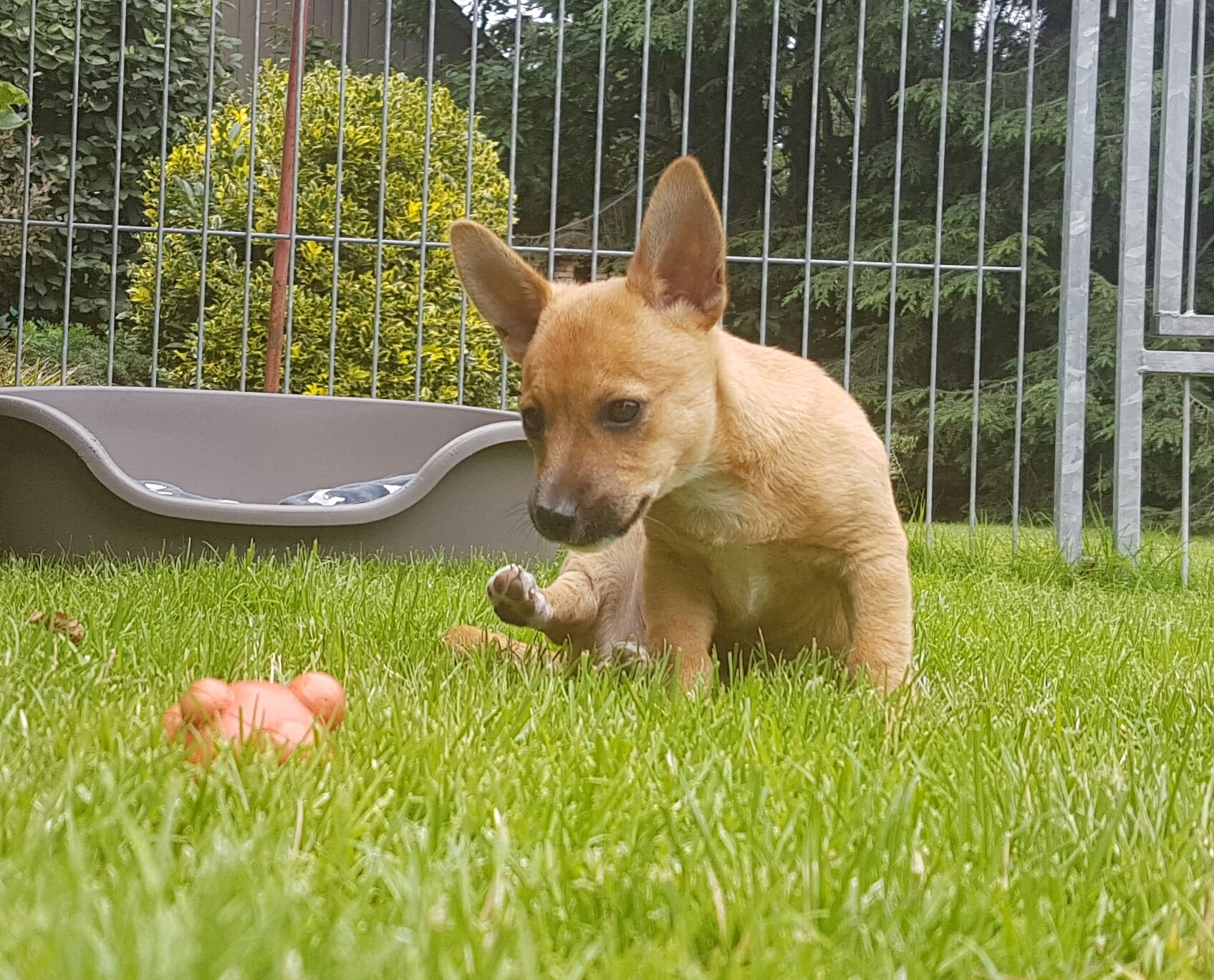 Imperio von den Rottentotten, ein kleiner Podengo Portugues Pequeno Welpe, „überlegt“, ob er sich das Püppchen holen soll.