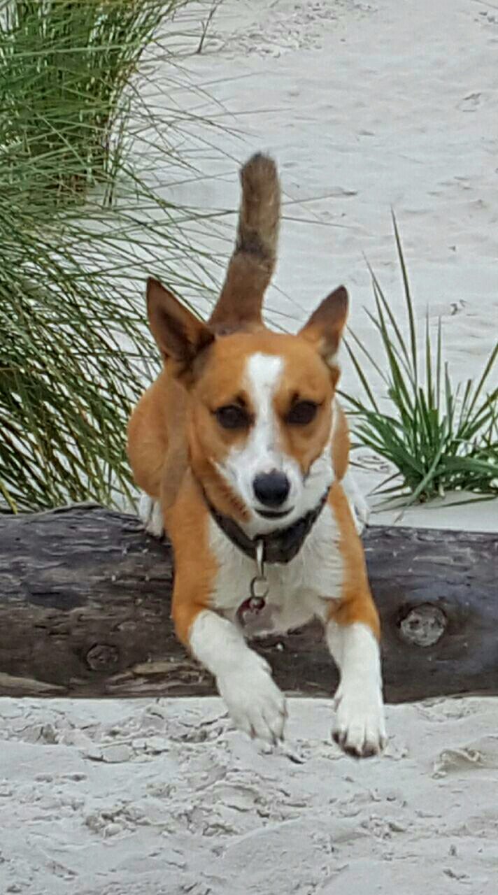 So ein kleiner portugiesischer Podengo kann auch springen. Fernando von den Rottentotten hat Fun daran.