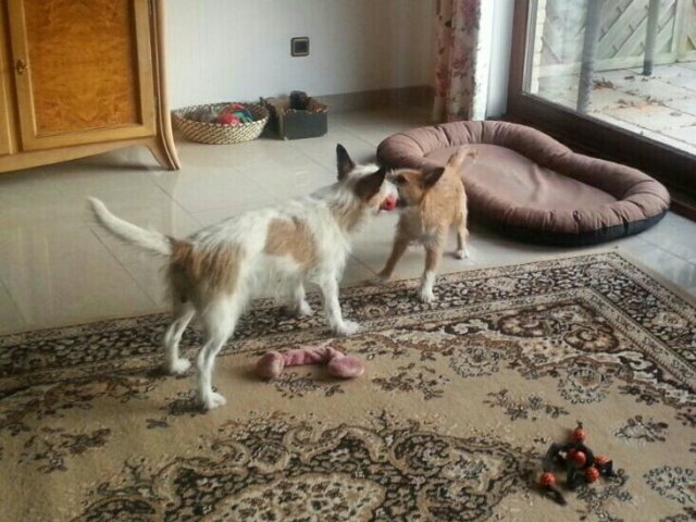 Unsere kleinen Podengos können sich auch innen gut beschäftigen. Isadora und Hiva machen Frühstückstheater…so ist es morgens, wenn wir frühstücken 😉