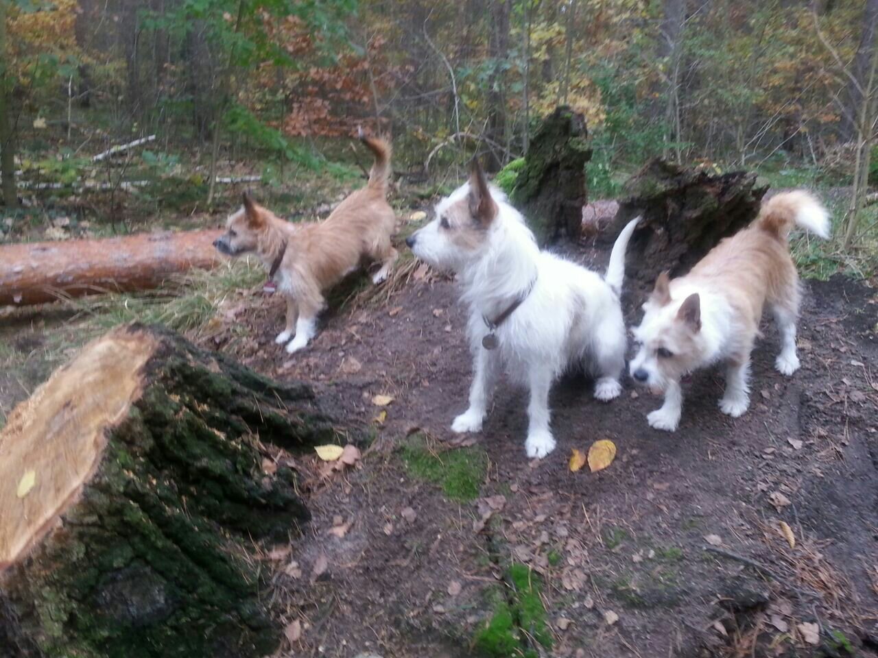 Im Grunewald ist Holzauktion! Der Sturm hat viele Bäume entwurzelt und unsere kleinen Podengos haben etwas zum Klettern.