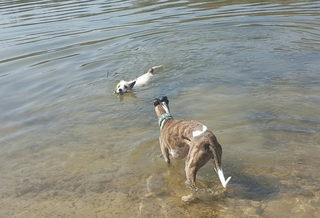 ätsch…Ich kann schon schwimmen scheint Hiva der wasserscheuen Krita zuzuzwinkern.