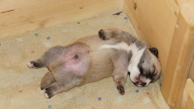 Der Kleine macht sich platt wie eine Flunder. Pequeno Welpe im Wohlfühlmodus.