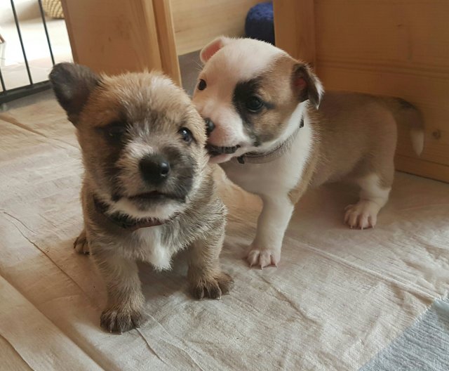 4 Wochen sind die Kleinen jetzt alt und gut beieinander, neugierig und aufgeschlossen. Und beide spielen miteinander, wie Welpen halt spielen. Heute ist Joca am Ohr von Jacinto…und morgen Jacinto am Hals von Joca. Also alles bestens 😉