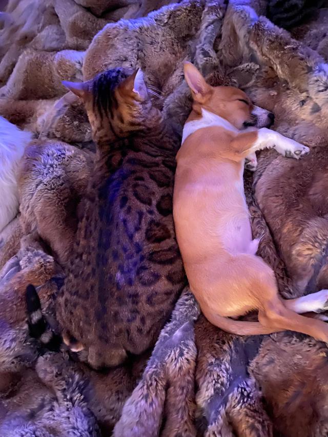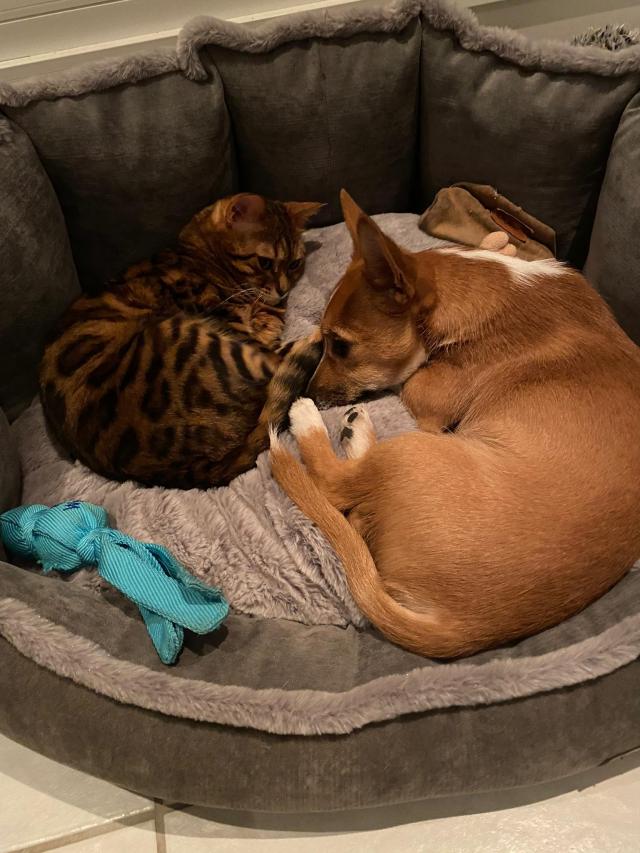 Zu den Freunden von Charlie gehört auch eine getigerte Katze. Beide Vertragen sich sehr gut, wie man aus den Bildern ersehen kann.
