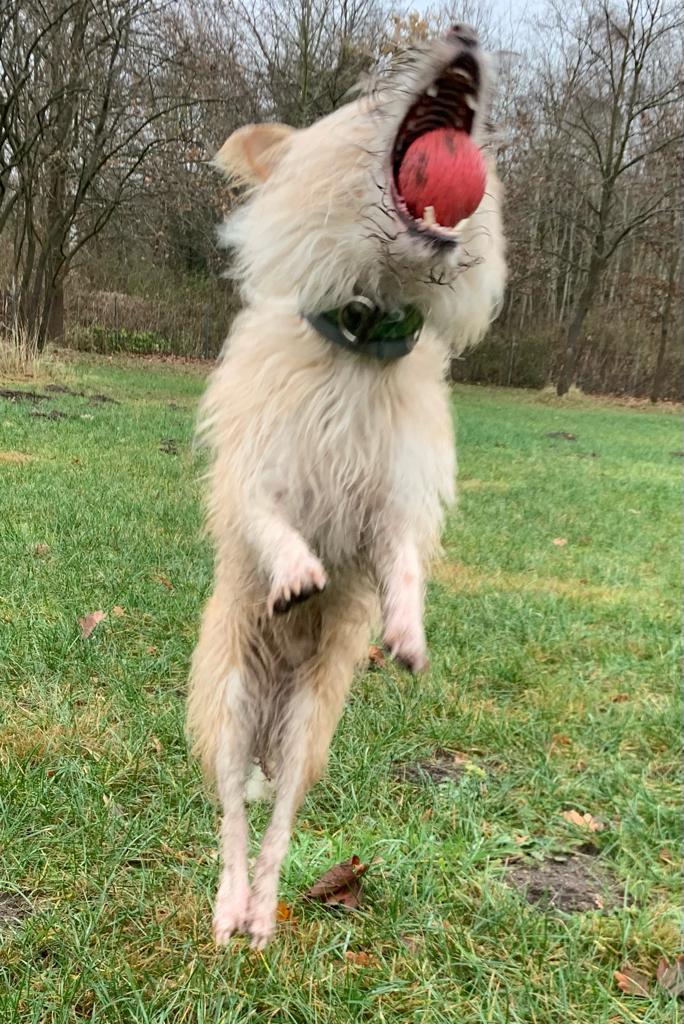 Rio ist immer am Ball. Er freut sich besonders, wenn Frauchen mit ihm „Ballwerfen“ spielt.